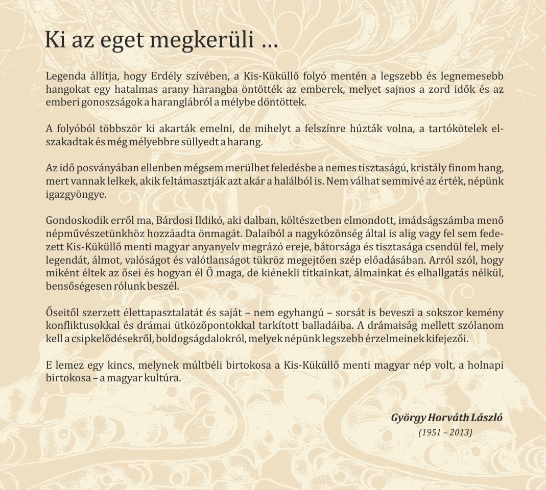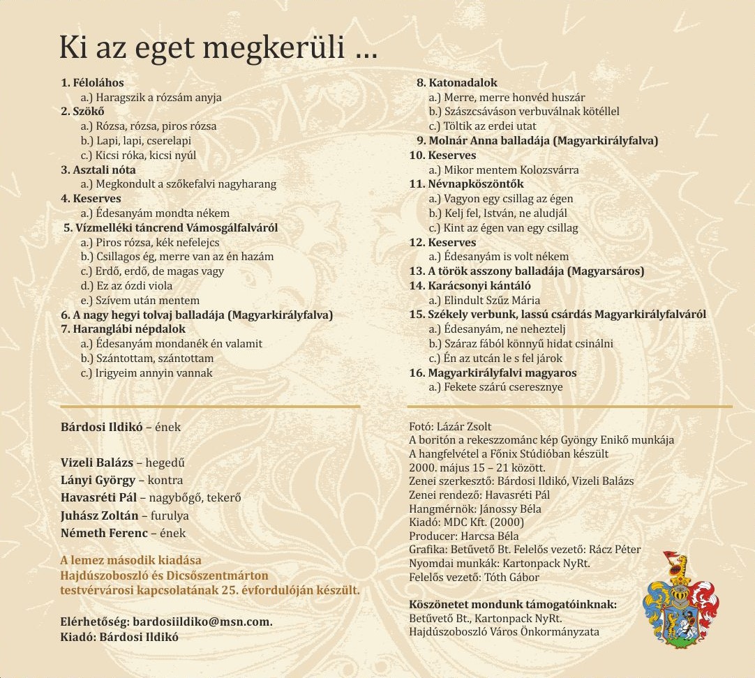 Ki az eget megkerüli... Haragszik A Rózsám Anyja… (Féloláhos)Kicsi Róka, Kicsi Nyúl… (Szökö)Megkondult A Szökefalvi Nagyharang… (Asztali Nóta)Édesanyám Mondta Nékem… (Keserves)Csillagos Ég Merre Van Az Én Hazám… (Vízmelléki Táncrend, Vámosgátfalva)A Nagy Hegyi Tolvaj Balladája (Magyarkirályfalva)Haranglábi NépdalokSzászcsáváson Verbuválnak Kötéllel… (Katonadalok)Molnár Anna Balladája (Magyarkirályfalva)Mikor Mentem Kolozsvárra… (Keserves)Vagyon Egy Csillag Az Égen… (Névnapköszöntök)Édesanyám Is Volt Nékem… (Keserves)A Török Asszony Balladája (Magyarsáros)Elindult Szüz Mária… (Karácsonyi Kántáló)Száraz Fából Könnyü Hidat Csinálni… (Székely Verbunk És Csárdás)Fekete Szárú Cseresznye… (Magyarkirályfalvi Magyaros)